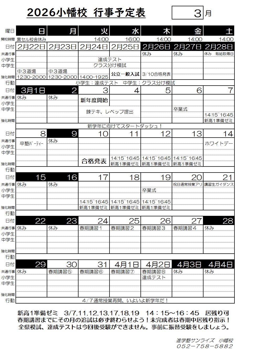2026年度 3月「特別」時間割