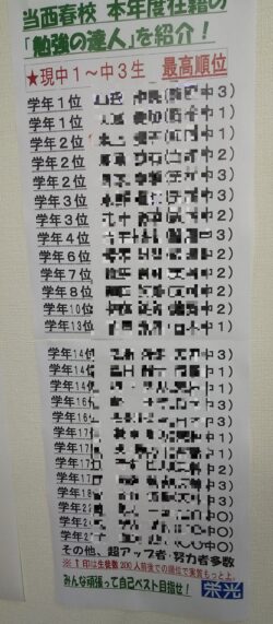 教室内では写真のような掲示物を貼り出しています。当年度内在籍で最高順位がベスト20以内の生徒をこうして公表するのです。更新意欲に繋がればと思います。もちろん望まない生徒は載せません。20位以内を取った生徒の中には、入塾時真ん中以下や真ん中よりちょっと上程度の生徒も何人か入っています。それらの生徒は「塾に入ったのをきっかけに勉強するようになった」「塾を変わったのをきっかけに気持ちも変わった」などの大きな変化が奏功していますね。