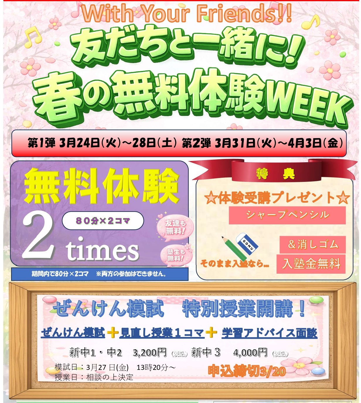 名古屋個別指導学院 四日市教室では、「友だちと一緒に!春の無料体験WEEK」を開催します。