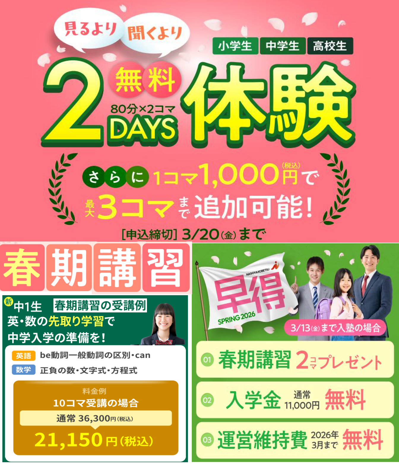 2026年1月31日 3:32 pm 名古屋個別指導学院では、新入塾生を受け付けております。2DAYS無料体験も随時行っております。 3月13日(金)までにお申し込みをされた方早得キャンペーンも行っております。 1. 2 DAYS無料体験 2. 早得キャンペーン 入学金11,000円が無料! 春期講習2コマプレゼント! 運営維持費~3月末まで無料! Categorised in: 季節講習, 未分類 This post was written by 白山悟 Comments are closed here.