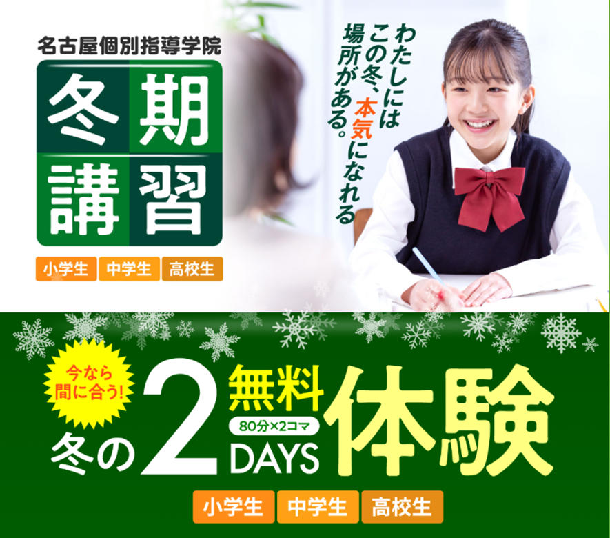 2025年12月17日 3:48 pm 名古屋個別指導学院では、冬期講習&新入塾生を受け付けております。2DAYS無料体験も随時行っております。 1月7日(水)までにお申し込みをされた方入塾金無料キャンペーンを行っております。 1. 冬の2 DAYS無料体験 2. 冬得キャンペーン 入学金11,000円が無料! Categorised in: 季節講習, 未分類 This post was written by shirayama Comments are closed here.