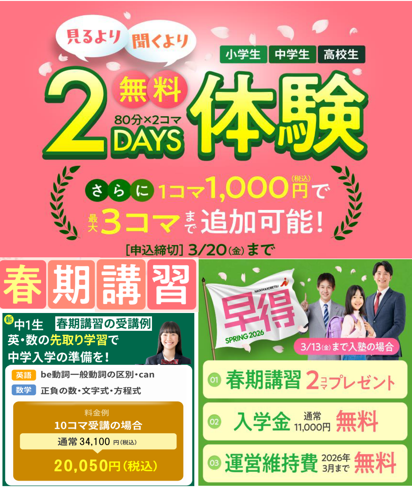 2026年1月31日 3:34 pm 名古屋個別指導学院では、新入塾生を受け付けております。2DAYS無料体験も随時行っております。 3月13日(金)までにお申し込みをされた方早得キャンペーンも行っております。 1. 2 DAYS無料体験 2. 早得キャンペーン 入学金11,000円が無料! 春期講習2コマプレゼント! 運営維持費~3月末まで無料! Categorised in: 季節講習, 未分類 This post was written by 白山悟 Comments are closed here.