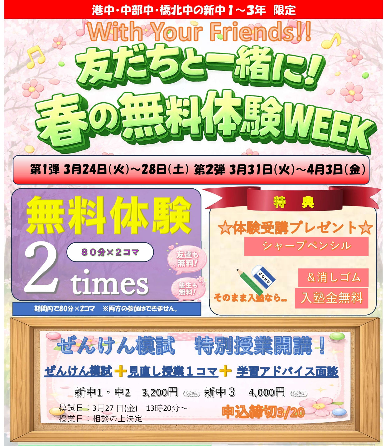 名古屋個別指導学院 四日市教室では、「友だちと一緒に!春の無料体験WEEK」を開催します。
