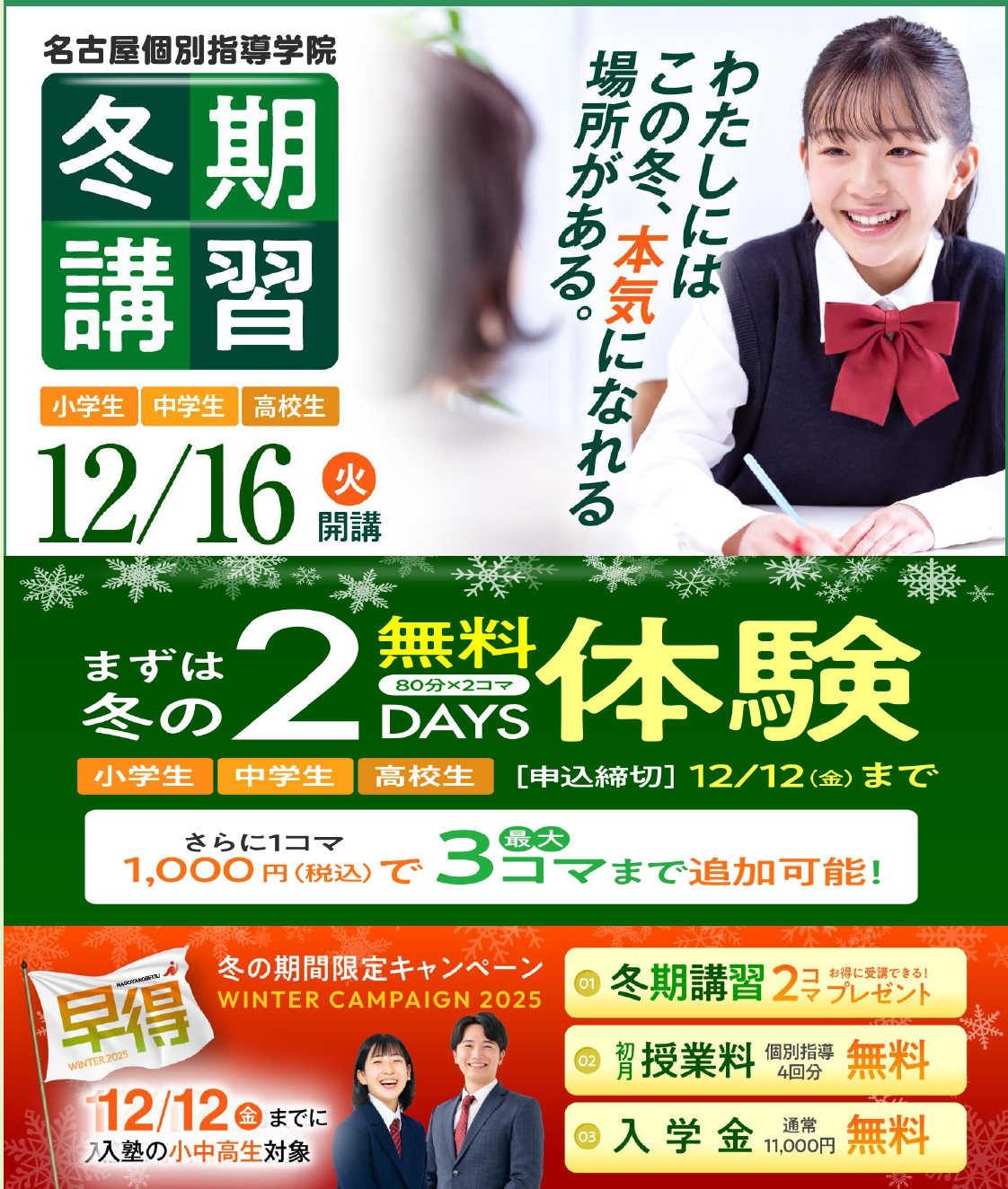 名古屋個別指導学院では、冬期講習&新入塾生を受け付けております。無料体験も随時行っております。