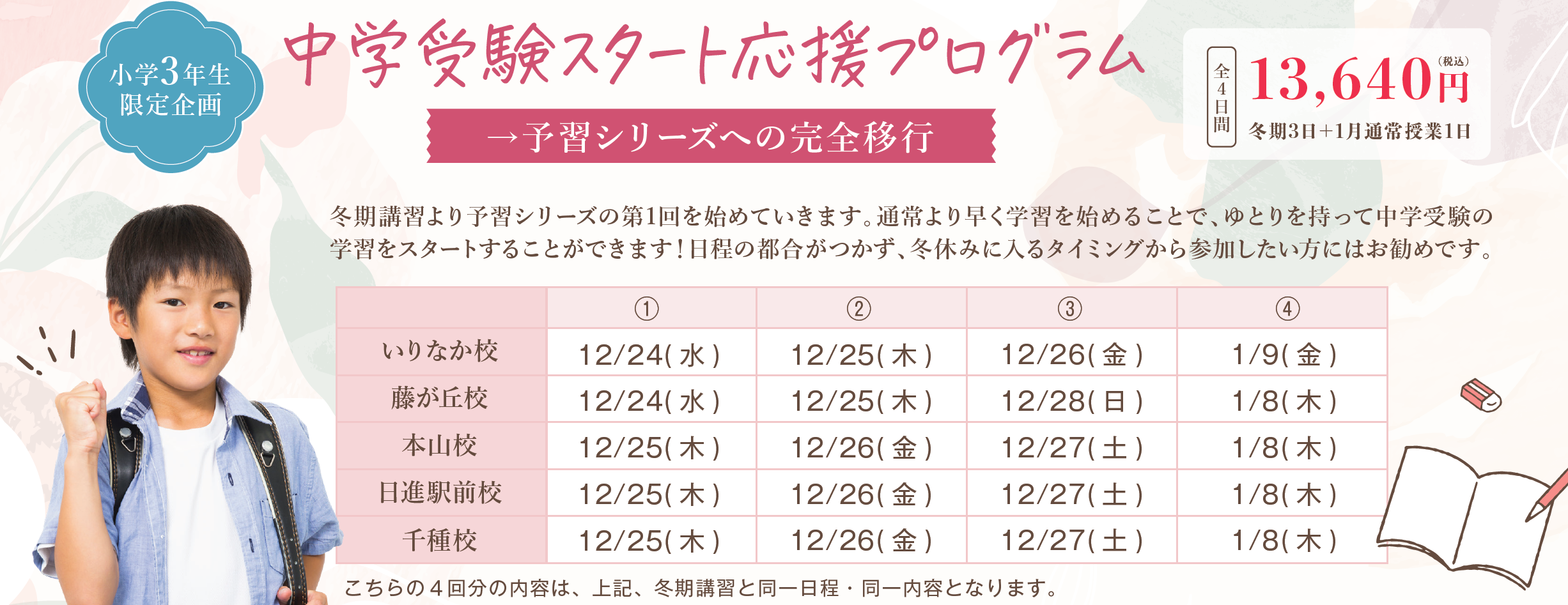 小4・小5は上記冬期講習期間での講習となりますので、ぜひお問い合わせください。