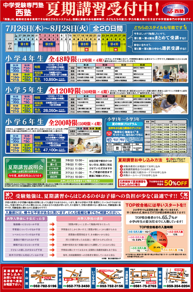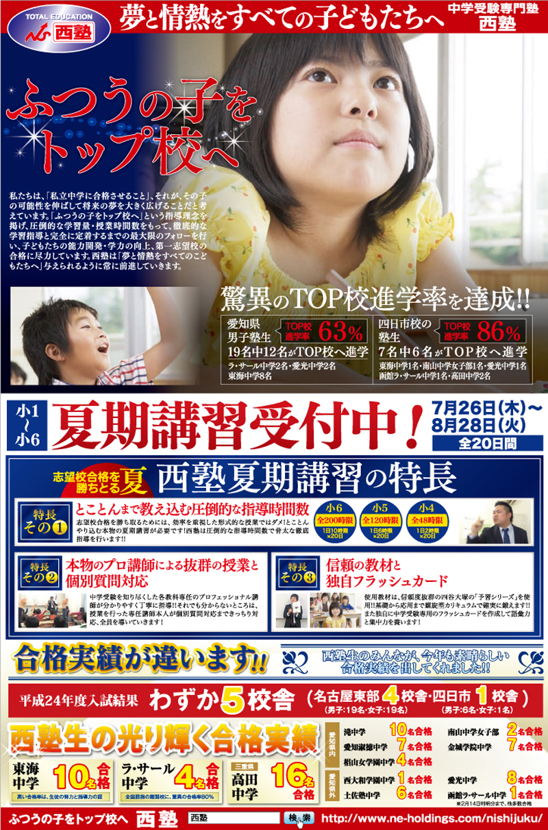 私立中学校へ導く西塾、名古屋市(藤ケ丘・本山・いりなか)・日進市・四日市市の中学受験専門塾