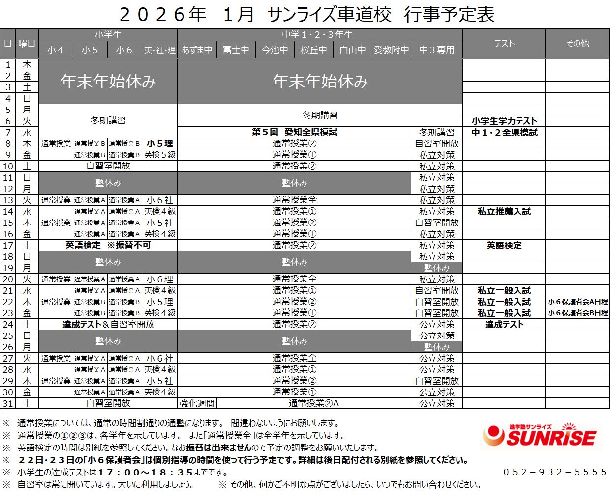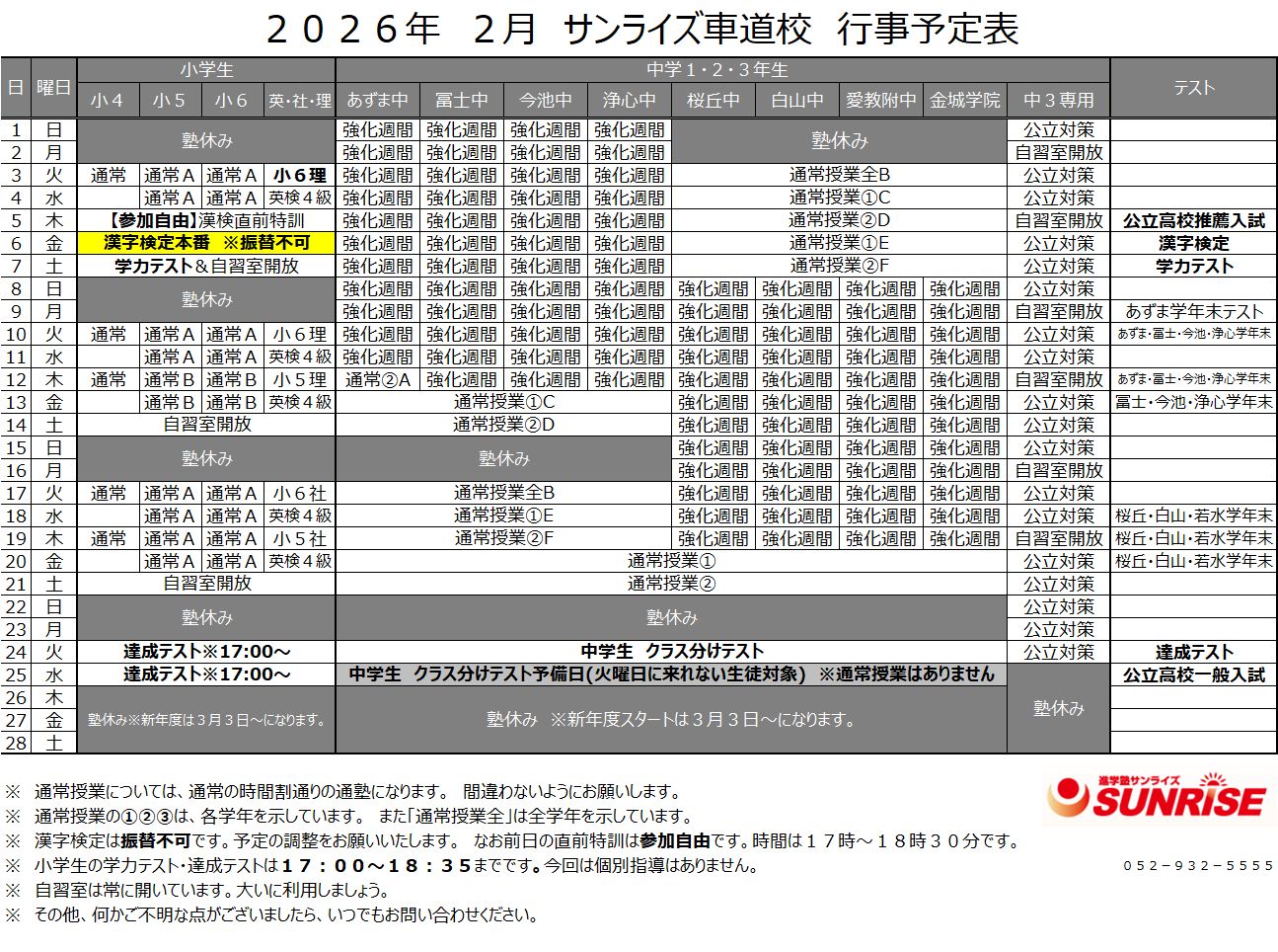 2026年度 3月「特別」時間割