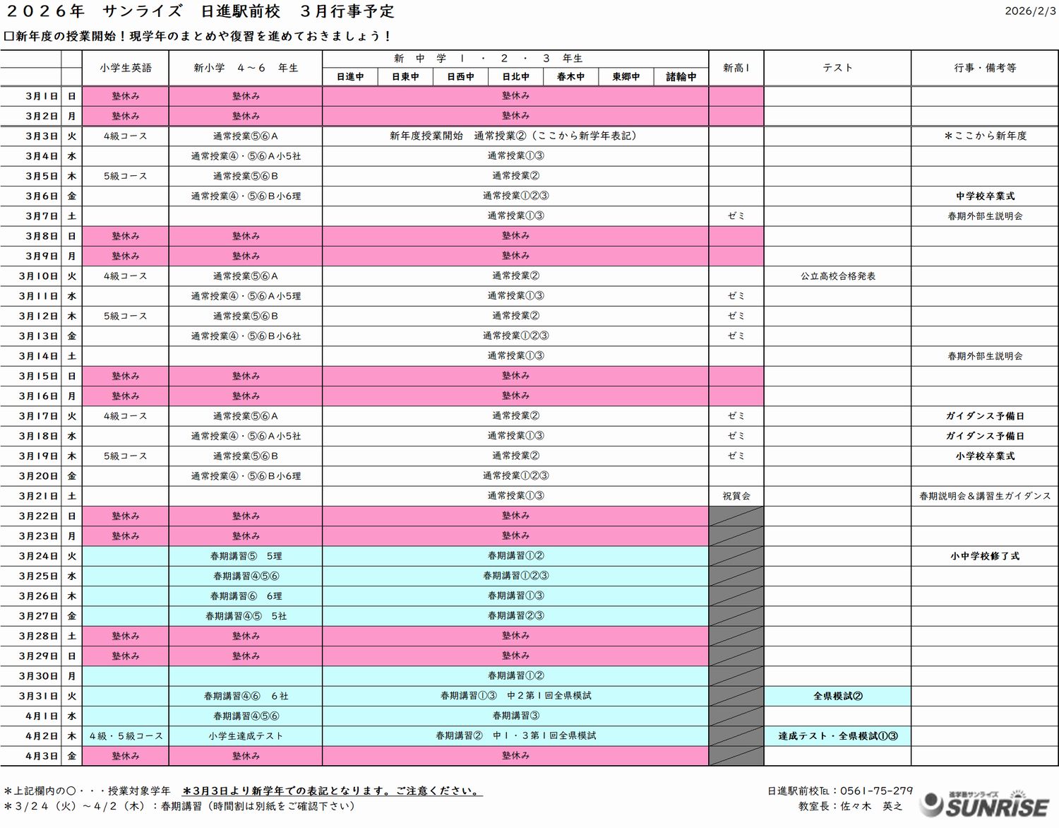 2026年度 3月「特別」時間割