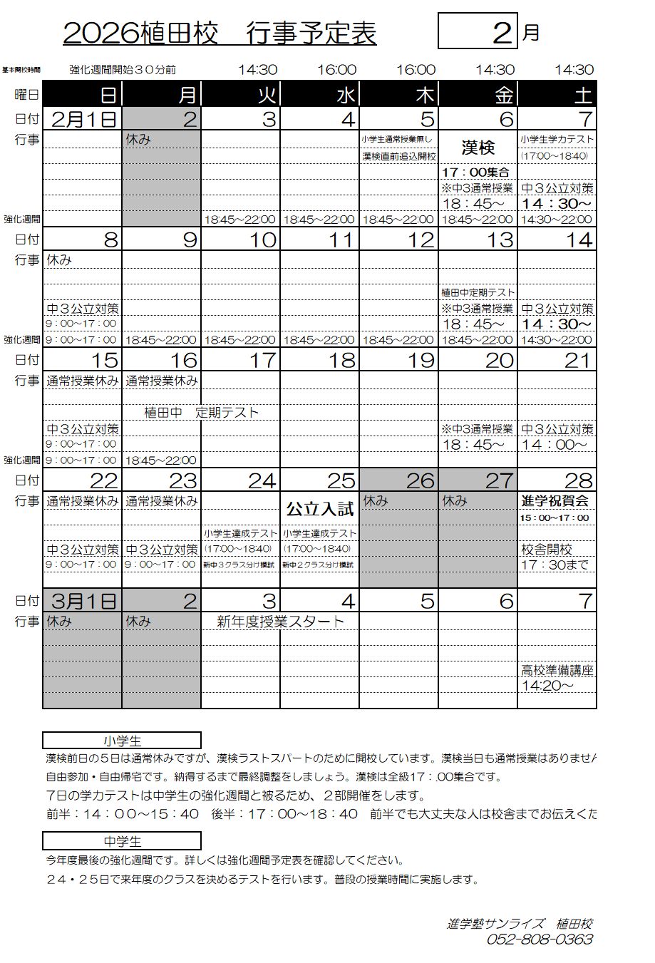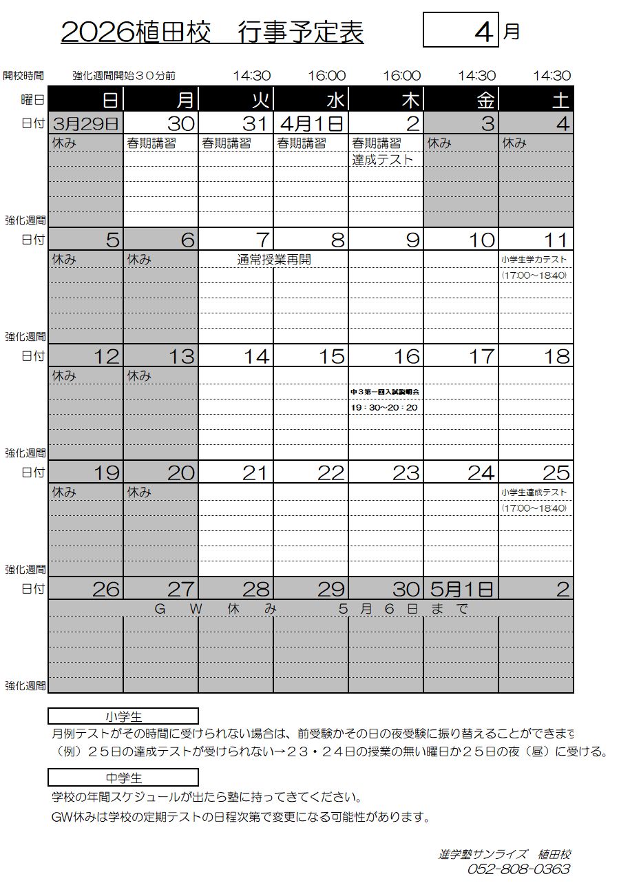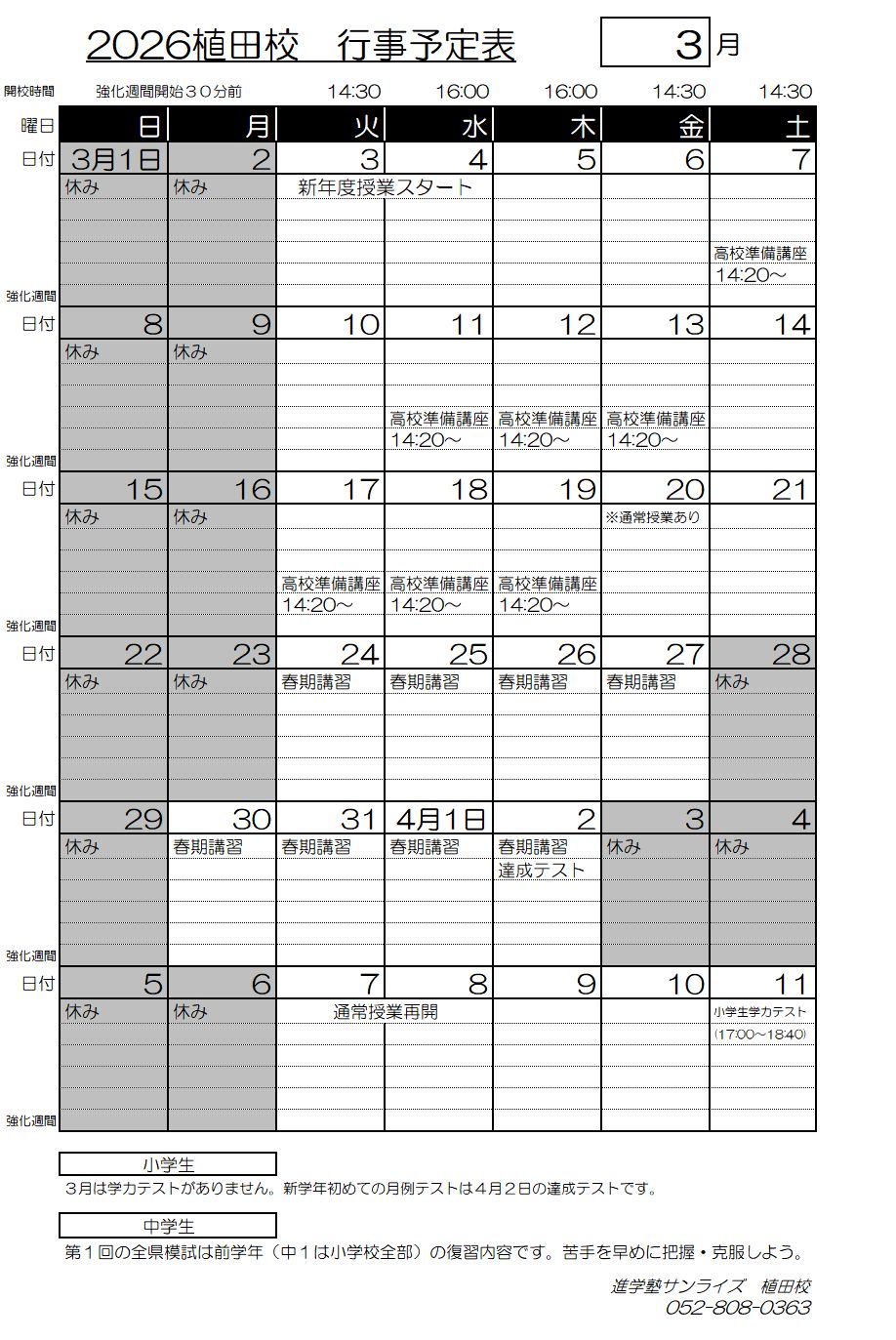 2026年度 3月「特別」時間割
