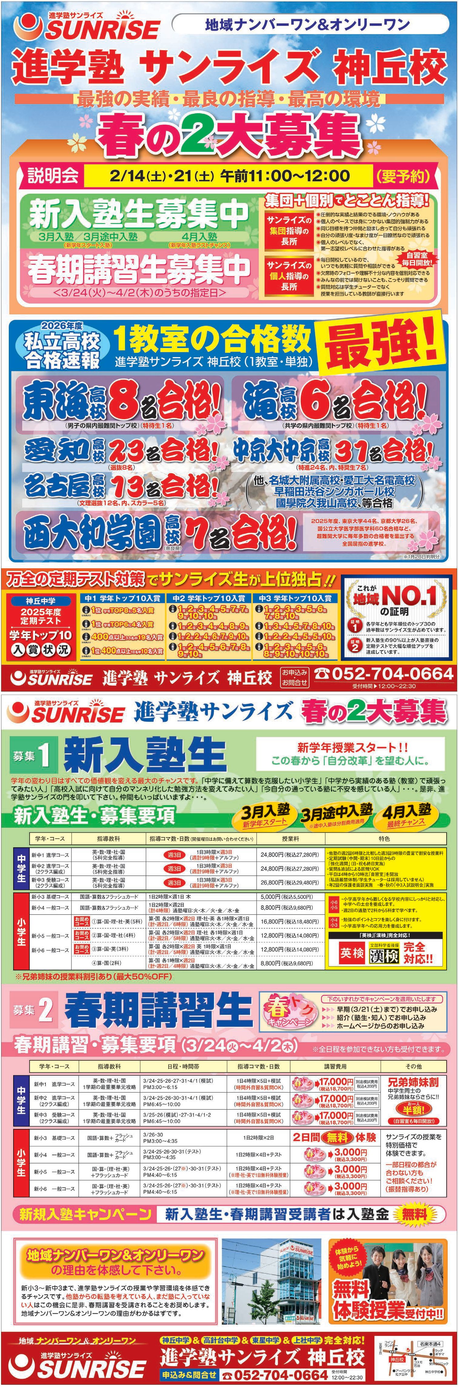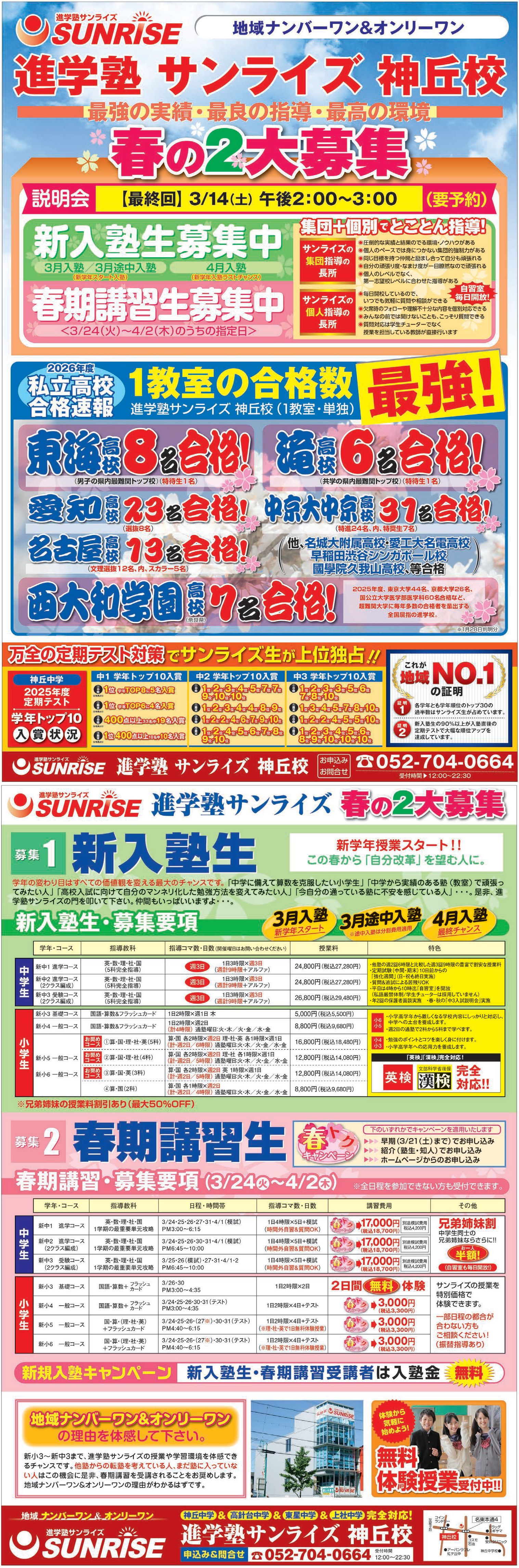 進学塾サンライズでは例年ご好評いただいております春期講習を3月24日(火)より開講いたします。充実した指導時間と濃い学習内容で生徒一人ひとりの学力を向上させる「本物の教育」を実践し、お子様の学習を最大限サポートさせていただきます。ぜひこの機会をご利用ください。